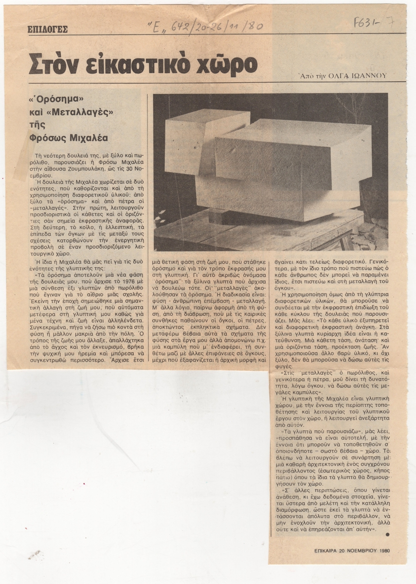 Απόκομμα, χαρτί ακανόνιστου μεγέθους, στα ελληνικά, δημοσίευσης κριτικής έκθεσης της Φρόσως Μιχαλέα, η οποία διεξάγεται στην Γκαλερί Ζουμπουλάκη, στην Αθήνα.