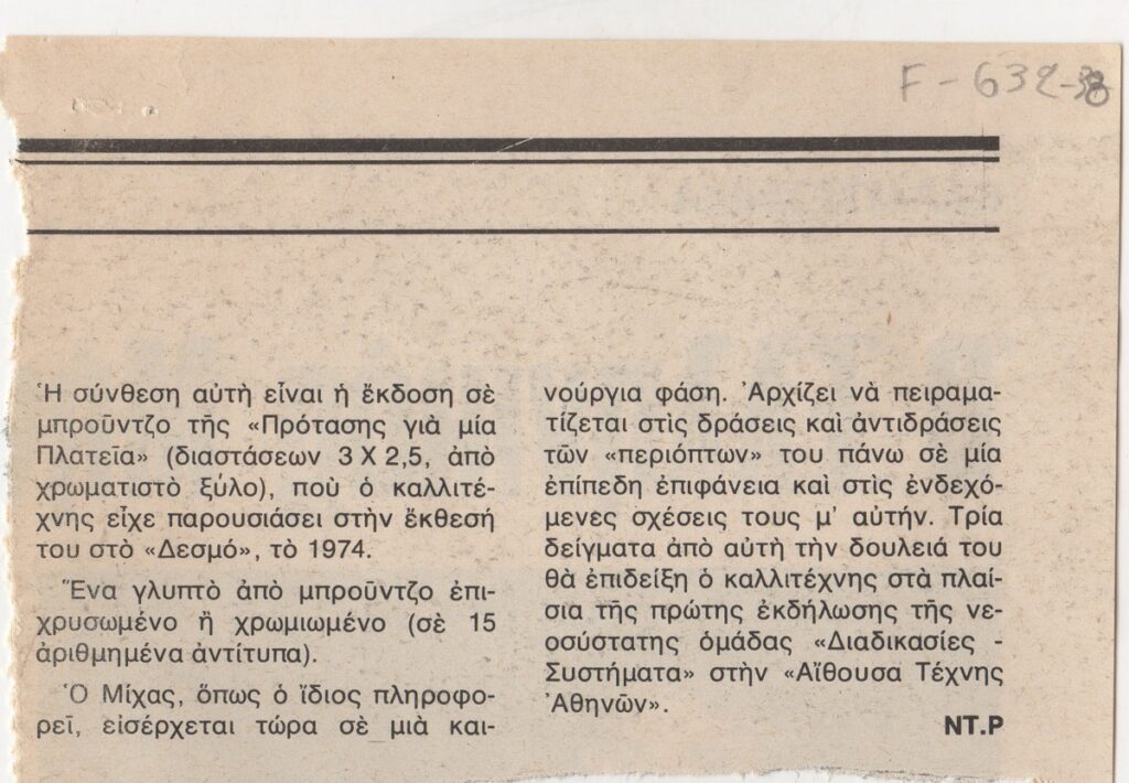 Απόκομμα, χαρτί, 2 φφ, 14×12,5 και 8×12,5 εκ., στα ελληνικά, δημοσίευσης κριτικής έκθεσης του Γιάννη Μίχα, η οποία διεξάγεται στην Αίθουσα Τέχνης Δεσμός στην Αθήνα.