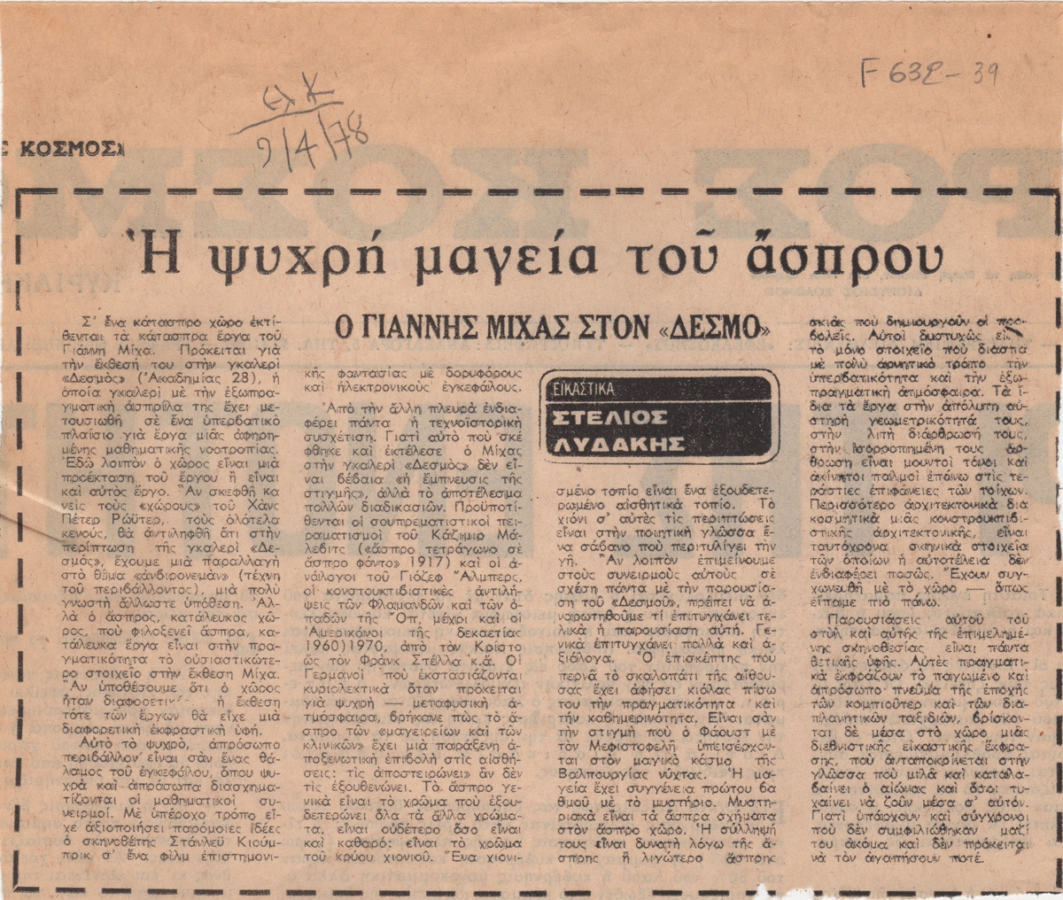 Απόκομμα, χαρτί, 17,5×20,5 εκ., στα ελληνικά, δημοσίευσης κριτικής έκθεσης του Γιάννη Μίχα, η οποία διεξάγεται στην Αίθουσα Τέχνης Δεσμός στην Αθήνα.