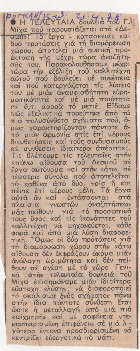 Απόκομμα, χαρτί, 13×5 εκ., στα ελληνικά, δημοσίευσης κριτικής έκθεσης του Γιάννη Μίχα, η οποία διεξάγεται στην Αίθουσα Τέχνης Δεσμός στην Αθήνα.