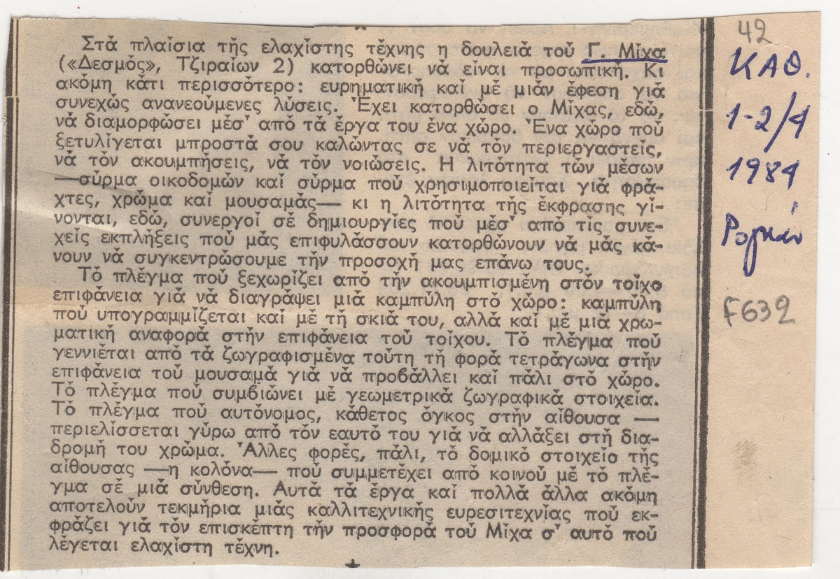 Απόκομμα, χαρτί, 8×11.5 εκ., στα ελληνικά, δημοσίευσης κριτικής έκθεσης του Γιάννη Μίχα, η οποία διεξάγεται στην Αίθουσα Τέχνης Δεσμός στην Αθήνα.