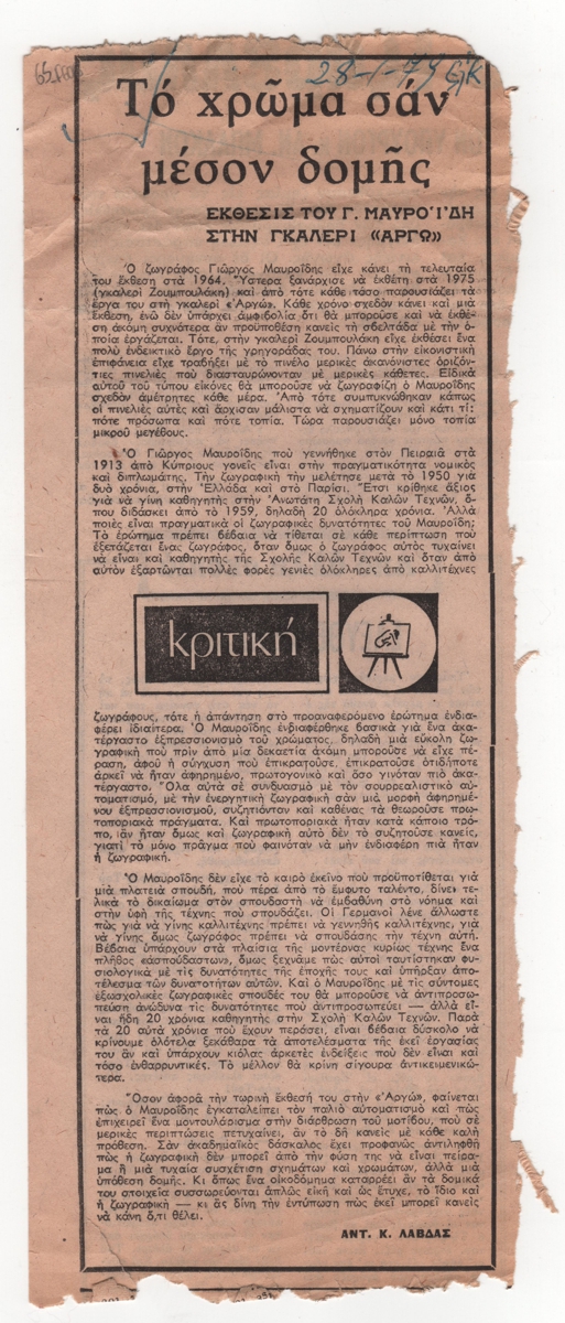 Απόκομμα εφημερίδας, στα ελληνικά, χαρτί, 29,2×11,4 εκ. Κριτική της ατομικής έκθεσης ζωγραφικής του Γιώργου Μαυροΐδη στην Αθήνα το 1979. Επάνω, επιγραφή με τα στοιχεία της δημοσίευσης.