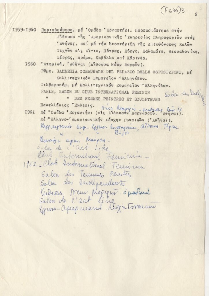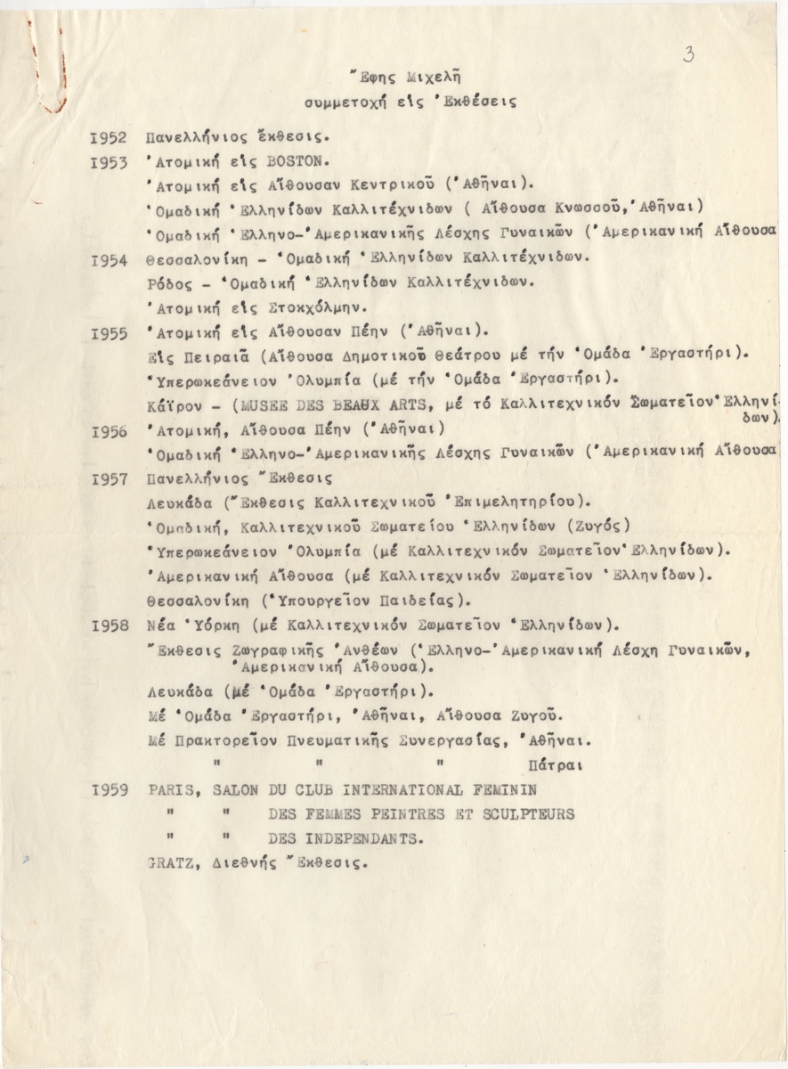 Λίστα, δακτυλόγραφο, χαρτί, 2 φφ, 28,5×21 εκ., στα ελληνικά, εκθέσεων της Έφης Μιχελή κατά την δεκαετία 1952-1962.