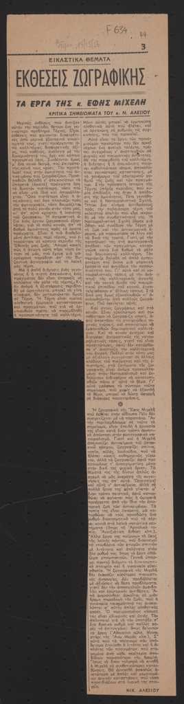 Απόκομμα, χαρτί, 46×11 εκ., στα ελληνικά, δημοσίευσης κριτικής έκθεσης της Έφης Μιχελή, η οποία διεξάγεται στην Αίθουσα Πέην, στην Αθήνα.