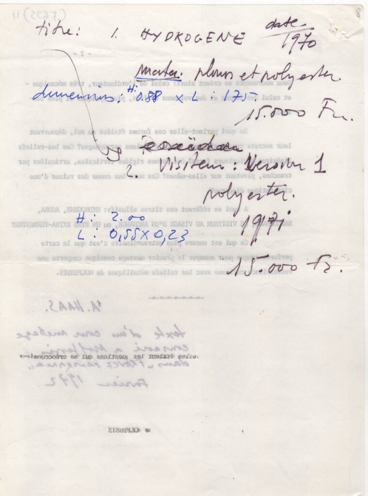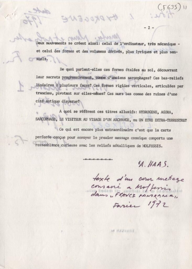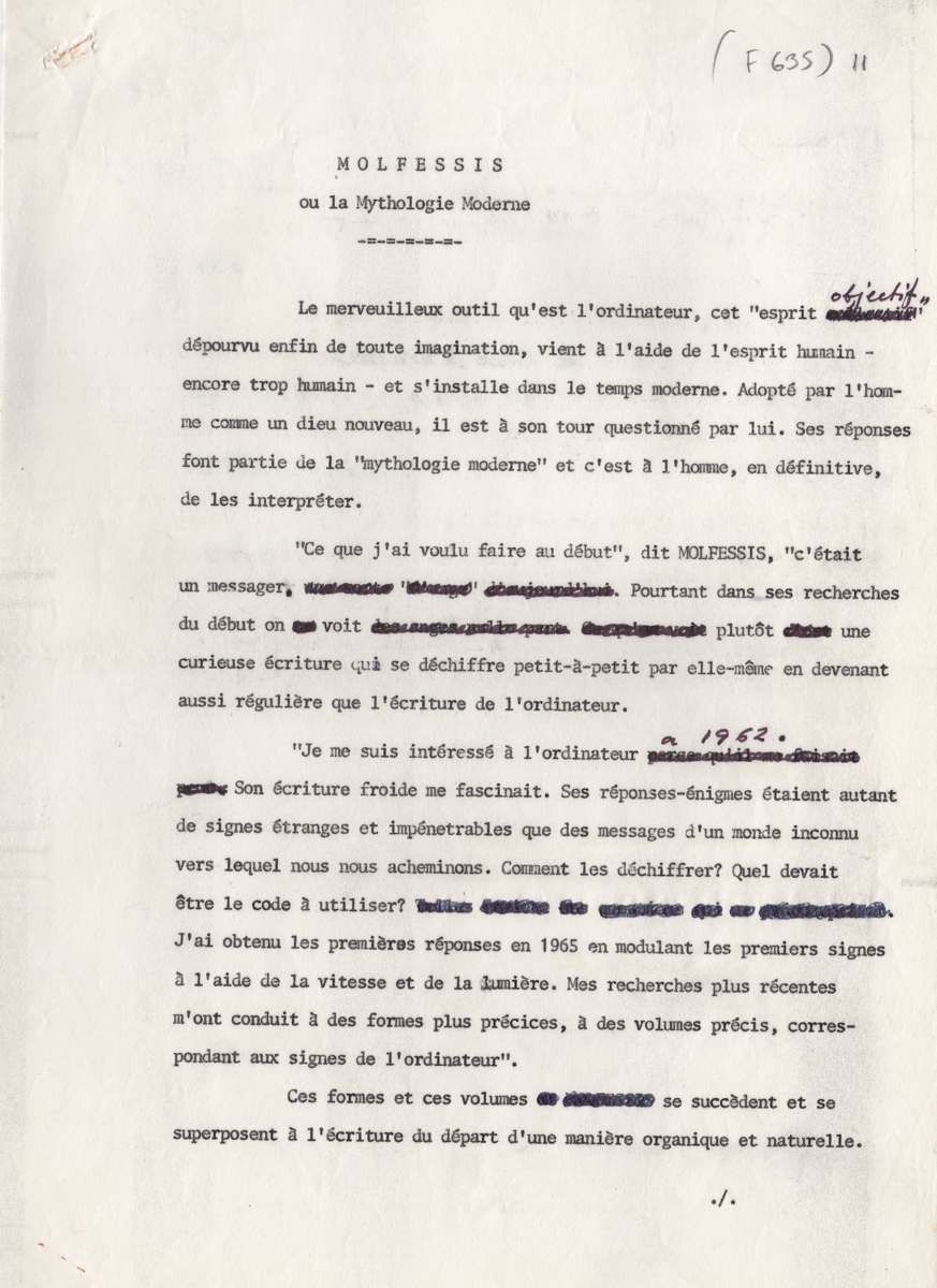 Κείμενο, δακτυλόγραφο, χαρτί, 2 φφ, 30×21 εκ., στα γαλλικά, για τον Ιάσωνα Μολφέση και το έργο του.Προέρχεται από ταινία μικρού μήκους αφιερωμένη στον καλλιτέχνη.