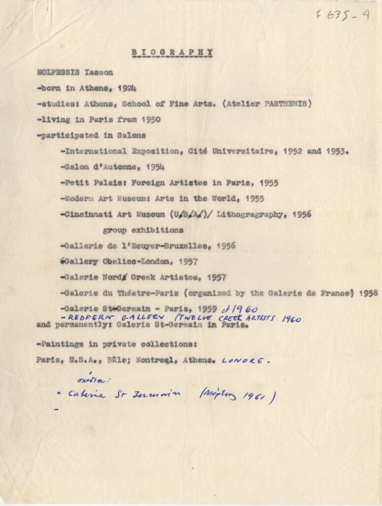 Βιογραφικό, δακτυλόγραφο, χαρτί, 27×21 εκ., στα αγγλικά, του Ιάσονα Μολφέση. Περιέχει σπουδές, συμμετοχή σε εκθέσεις και συλλογές στις οποίες βρίσκονται έργα του.