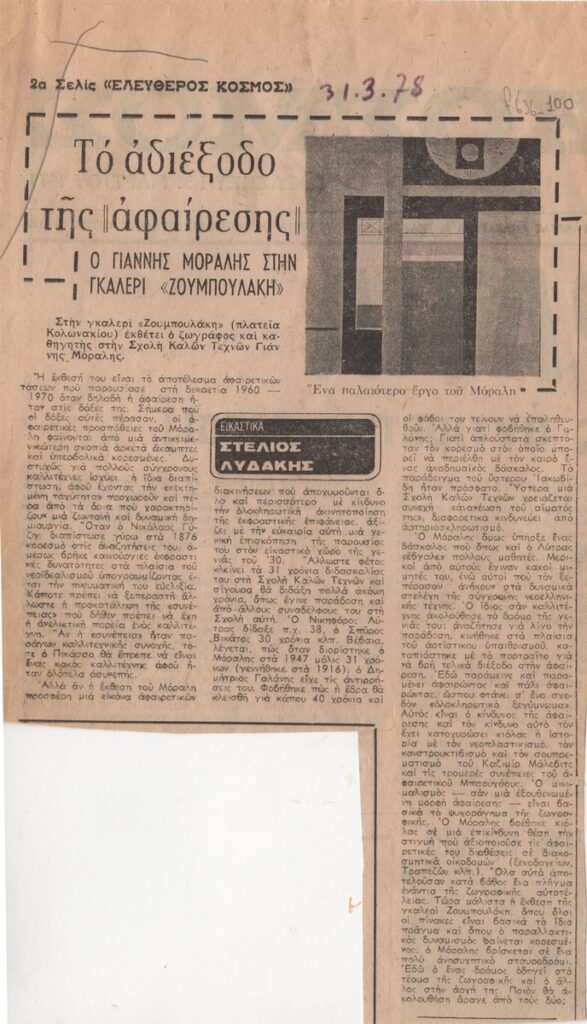 Απόκομμα της εφημερίδας “Ελεύθερος Κόσμος” (31/03/1978) δημοσίευσης κριτικής έκθεσης του Γιάννη Μόραλη, η οποία διεξάγεται στην Γκαλερί Ζουμπουλάκη, στην Αθήνα.
