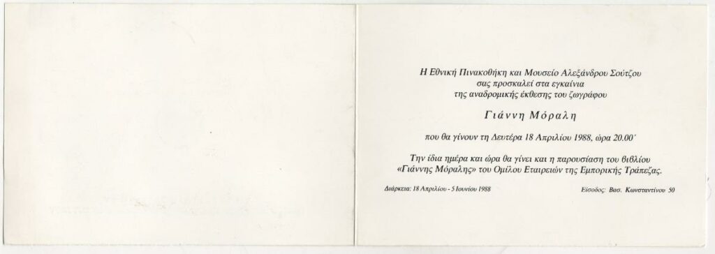 Πρόσκληση αναδρομικής έκθεσης έργων ζωγραφικής του Γιάννη Μόραλη, στην Εθνική Πινακοθήκη Αθηνών. Σημειώνεται η παρουσίαση τιμητικού λευκώματος για τον καλλιτέχνη, την ημέρα των εγκαινίων.