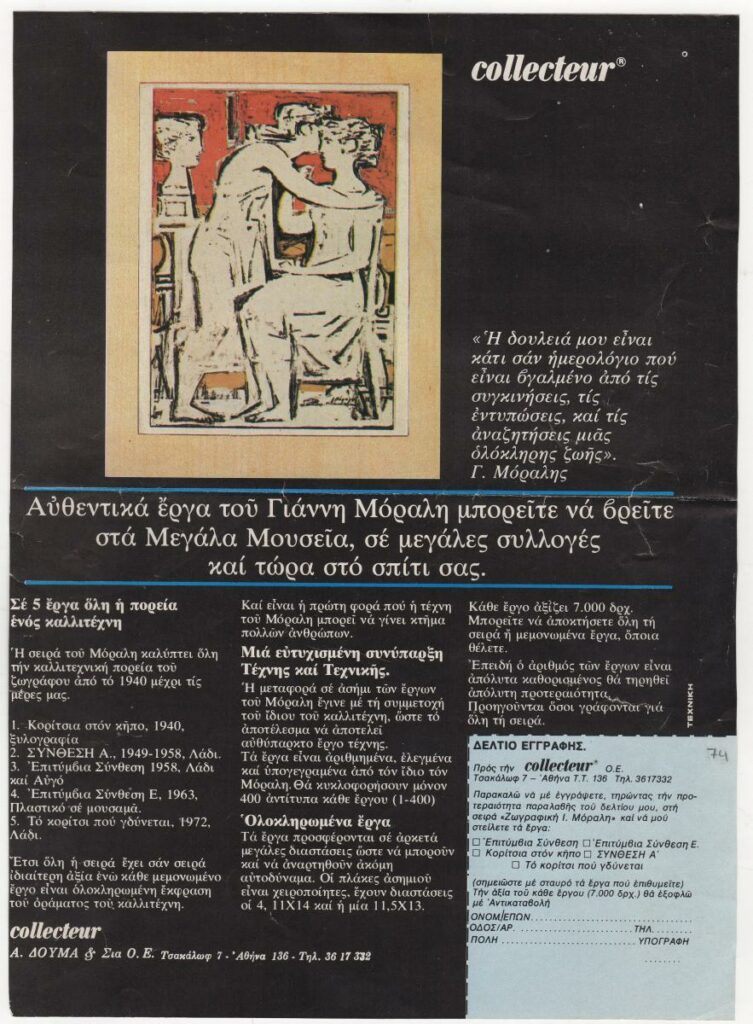 Απόκομμα διαφημιστικού φυλλάδιου της εταιρείας “Collecteur”, αναφερόμενο στην απόκτηση αντιγραφών έργων του Γιάννη Μόραλη. Δίνονται πληροφορίες για τα έργα και τον τρόπο απόκτησής τους.
