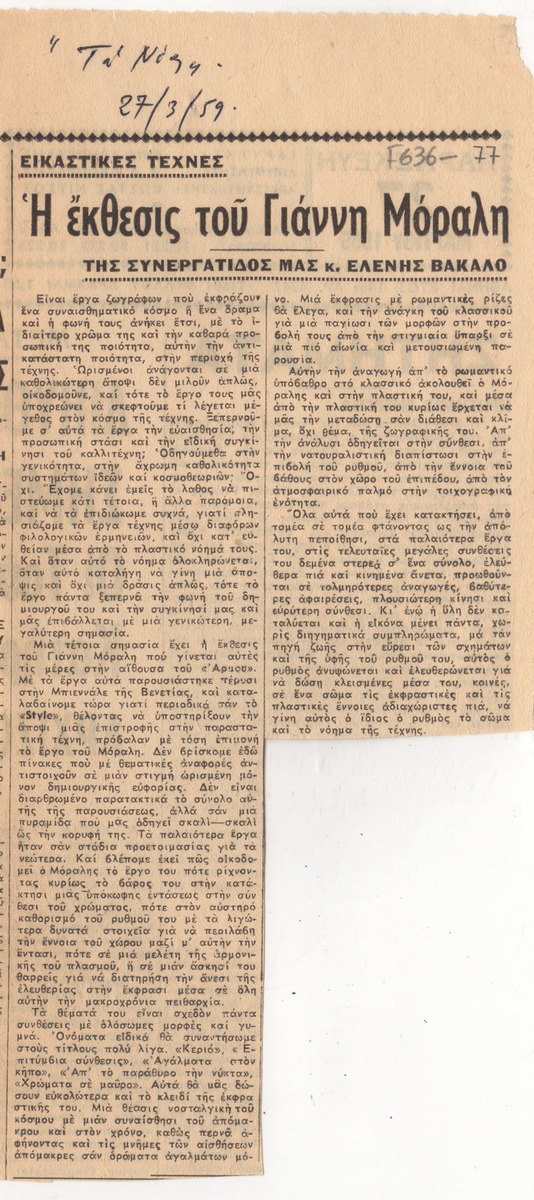 Απόκομμα της εφημερίδας “Τα Νέα” (27/03/1959) δημοσίευσης κριτικής έκθεσης του Γιάννη Μόραλη, που παρουσιάζεται στην αίθουσα Τέχνης “Αρμός”, στην Αθήνα.