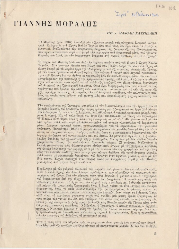 Απόκομμα του περιοδικού “Ζυγός” (07/1962) δημοσίευσης άρθρου για τον Γιάννη Μόραλη και το έργο του.