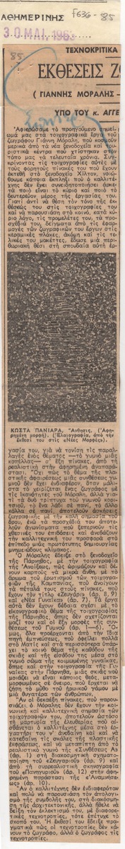 Απόκομμα της εφημερίδας “Η Καθημερινή” (30/05/1963) δημοσίευσης κριτικής έκθεσης του Γιάννη Μόραλη, η οποία διεξάγεται στην Αίθουσα Τέχνης Αθηνών Χίλτον.