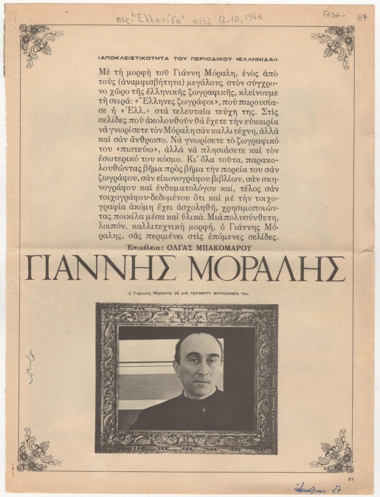 Απόκομμα του περιοδικού “Ελληνίδα” (12/10/1966) δημοσίευσης άρθρου αναφερόμενου στη ζωή και το έργο του Γιάννη Μόραλη. Δίνονται βιογραφικές πληροφορίες για τον καλλιτέχνη και αποσπάσματα συνεντεύξεων.