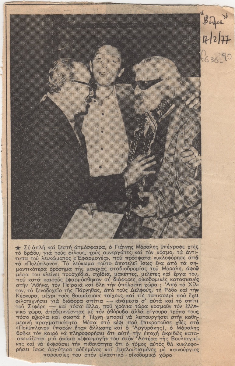 Απόκομμα της εφημερίδας “Το Βήμα” (17/02/1977) δημοσίευσης άρθρου αναφερόμενου στην παρουσίαση λευκώματος του Γιάννη Μόραλη, στην Αίθουσα Τέχνης Πολυπλάνο.