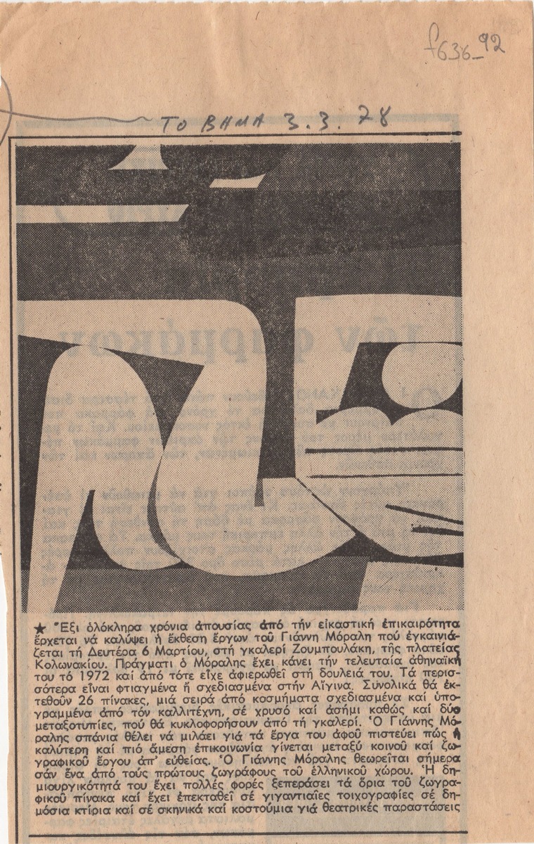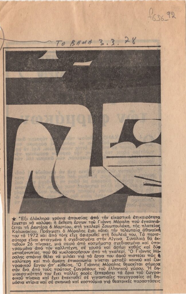 Απόκομμα της εφημερίδας “Το Βήμα” (03/03/1978) δημοσίευσης άρθρου αναφερόμενου στα εγκαίνια έκθεσης του Γιάννη Μόραλη, η οποία διεξάγεται στην Γκαλερί Ζουμπουλάκη στην Αθήνα.