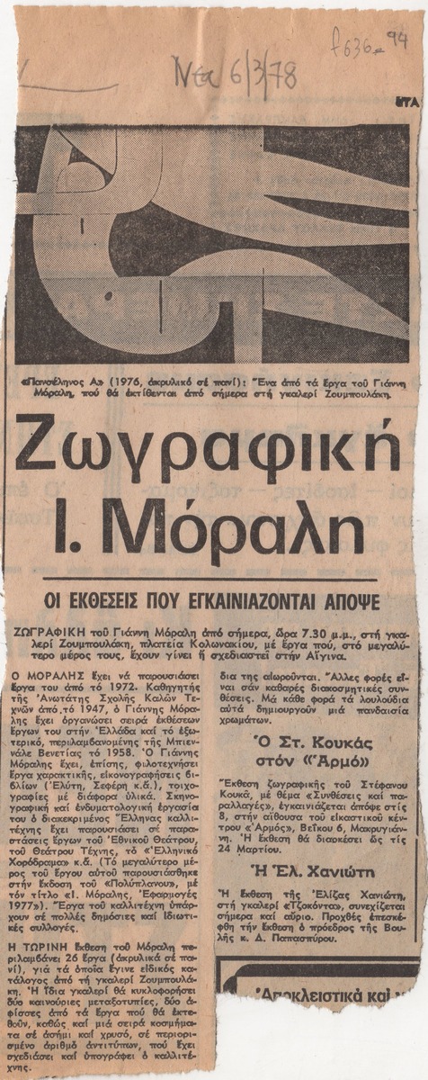Απόκομμα της εφημερίδας “Τα Νέα” (06/03/1978) δημοσίευσης άρθρου αναφερόμενου σε εκθέσεις τις περιόδου. Ειδικότερα γίνεται λόγος για τα εγκαίνια έκθεσης του Γιάννη Μόραλη, στην γκαλερί Ζουμπουλάκη στην Αθήνα. Ακόμη, για την ατομική έκθεση του Στέφανου Κουκά στον “Αρμό”, με “Συνθέσεις και Παραλλαγές” του καλλιτέχνη και έκθεση της Ελίζας Χανιώτη στην γκαλερί “Τζοκόντα”.
