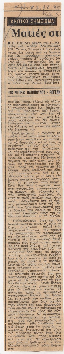 Απόκομμα της εφημερίδας “Η Καθημερινή” (08/03/1978) δημοσίευσης κριτικής έκθεσης του Γιάννη Μόραλη, η οποία διεξάγεται στην Γκαλερί Ζουμπουλάκη, στην Αθήνα.