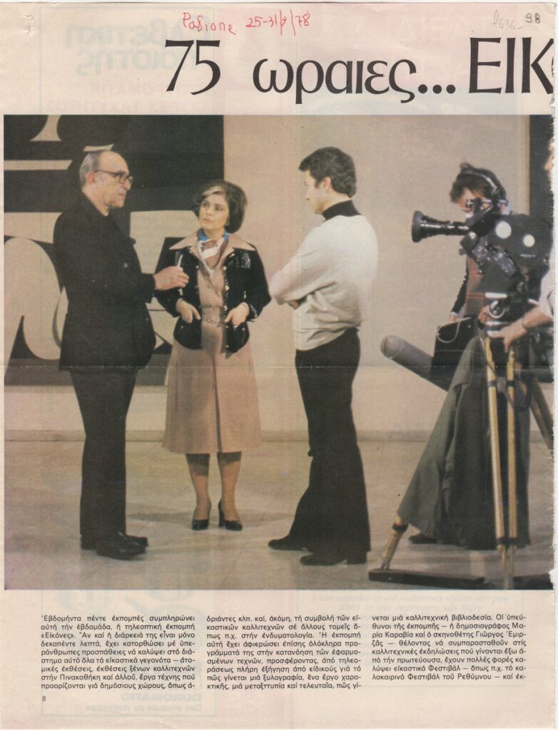 Απόκομμα του περιοδικού “Ραδιοπρόγραμμα” (25/03/1978) δημοσίευσης άρθρου που αναφέρεται στη συμπλήρωση 75 εκπομπών της τηλεοπτικής σειράς “Εικόνες”, που καλύπτει τα πολιτιστικά ελληνικά δρώμενα. Στο κείμενο γίνεται λόγος για την εκπομπή του Μαρτίου 1978, αφιερωμένη στον Γιάννη Μόραλη με αφορμή ατομική έκθεσή του στην γκαλερί Ζουμπουλάκη.