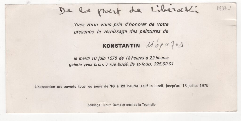 Πρόσκληση εγκαινίων της ατομικής έκθεσης του Konstantin (Μόραλη) στο Παρίσι το 1975. Στην επιφάνεια του εντύπου επιγραφές.
