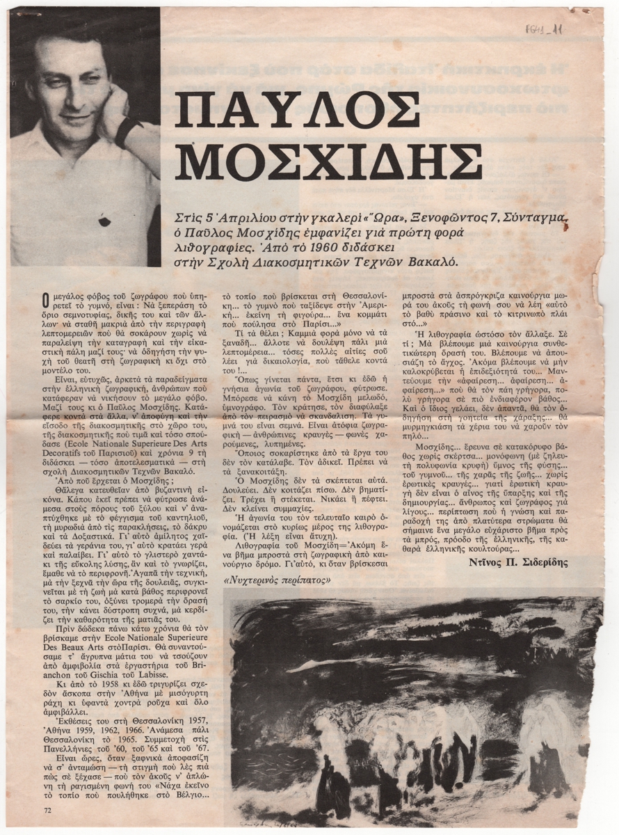 Απόκομμα, έντυπο, χαρτί, 2 φφ., 33,5×24,5 εκ., όπου δημοσιεύεται, στα ελληνικά, άρθρο του Ντίνου Π. Σιδερίδη για την ατομική έκθεση λιθογραφίας του Παύλου Μοσχίδη στην Αθήνα το 1969 (;). Στην πίσω όψη απόσπασμα άρθρου για την ιταλίδα σταρ του κινηματογράφου Έλσα Μαρτινέλλι και πολιτιστική επικαιρότητα της περιόδου.