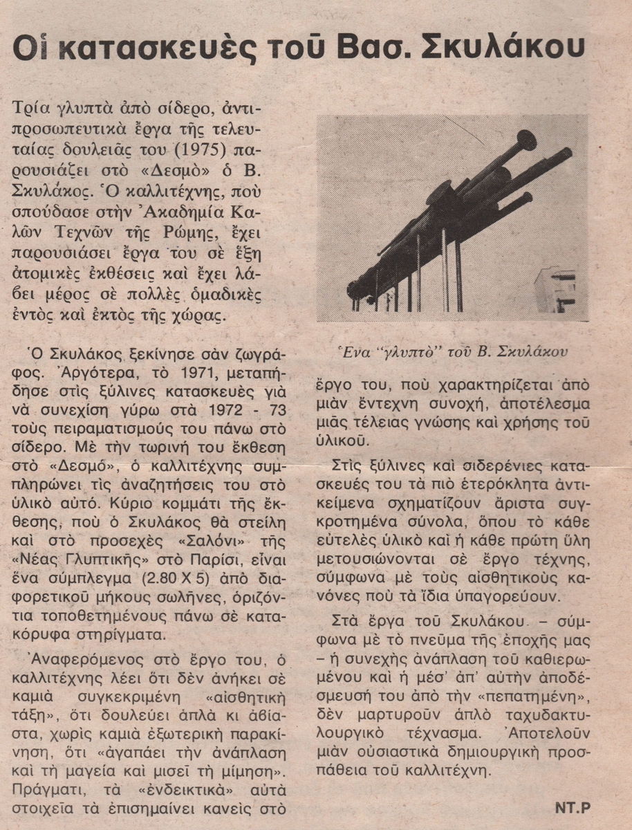 Απόκομμα, έντυπο, χαρτί, 33,5×24,0 εκ., όπου δημοσιεύεται, στα ελληνικά, κριτική της Ντόρας Ηλιοπούλου Ρογκάν για την ατομική έκθεση του Βασίλη Σκυλάκου στην Αθήνα το 1976. Εικονογραφείται με αναπαραγωγή έργου. Στο ίδιο τεκμήριο δημοσιεύονται άλλα τέσσερα κείμενα της Ντ. Ηλιοπούλου Ρογκάν με τους εξής τίτλους: “Το γυμνό στη ζωγραφική του Π. Μοσχίδη”, “‘Αφιέρωμα στον Χρ. Καρά”, “Πολλαπλά από τον Γιάννη Μίχα” και αναγγελία της φωτογραφικής έκθεσης του Θανάση Διαμαντόπουλου με πορτραίτα του Κώστα Βάρναλη. Στην πίσω όψη του πρώτου φύλλου, άρθρο με τίτλο “‘Στη φωλιά του Κούκου’ με την ‘Νέα Σκηνή΄ του Εθνικού” και άρθρο του Α. Δ. Σκιαδά με τίτλο “Οι απαραίτητοι”. Στην πίσω όψη του δεύτερου φύλλου, απόσπασμα άρθρου του Τσαρλς Σπένσερ για τον “Ελληνικό Μήνα” στο Λονδίνο Στην πρώτη σελίδα επιγραφή.