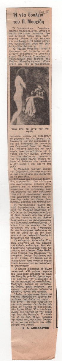 Απόκομμα, έντυπο, χαρτί, 37,5×4,8 εκ, όπου δημοσιεύεται, στα ελληνικά, κριτική του Κ. Δ. Λιναρδάτου σχετικά με την έκθεση έργων του Παύλου Μοσχίδη στην Αθήνα το 1976. Εικονογραφείται με αναπαραγωγή έργου.