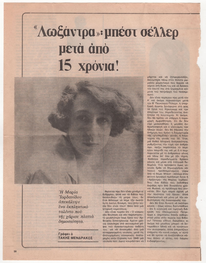Απόκομμα, έντυπο, χαρτί, 30,0×23,0 εκ., όπου δημοσιεύεται, στα ελληνικά, άρθρο του Τάκη Μενδράκου για την επιτυχία του βιβλίου “Λωξάντρα” της Μαρίας Ιορδανίδου 15 χρόνια μετά την πρώτη του έκδοση. Στο ίδιο τεκμήριο δημοσιεύονται: το άρθρο της Λιλάντας Λικιαρδοπούλου “Ο ζωγράφος που ανιχνεύει ερωτικά την ύλη” και απόσπασμα άρθρου για τις καρικατούρες γνωστών προσωπικοτήτων του David Levine.