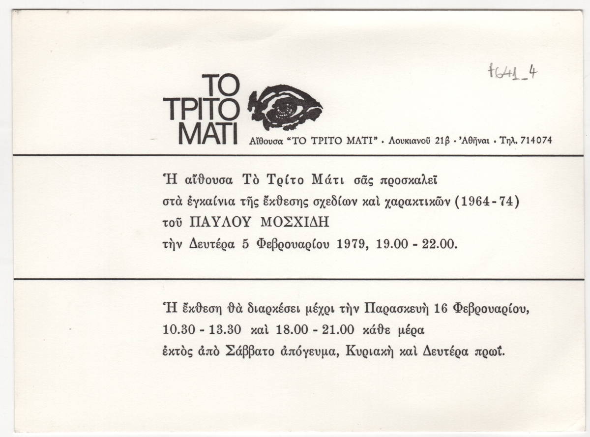 Έντυπο, στα ελληνικά, μονόφυλλο, χαρτόνι, 13,3×18,0 εκ. Πρόσκληση εγκαινίων της ατομικής έκθεσης σχεδίων και χαρακτικών του Παύλου Μοσχίδη στην Αθήνα το 1979.