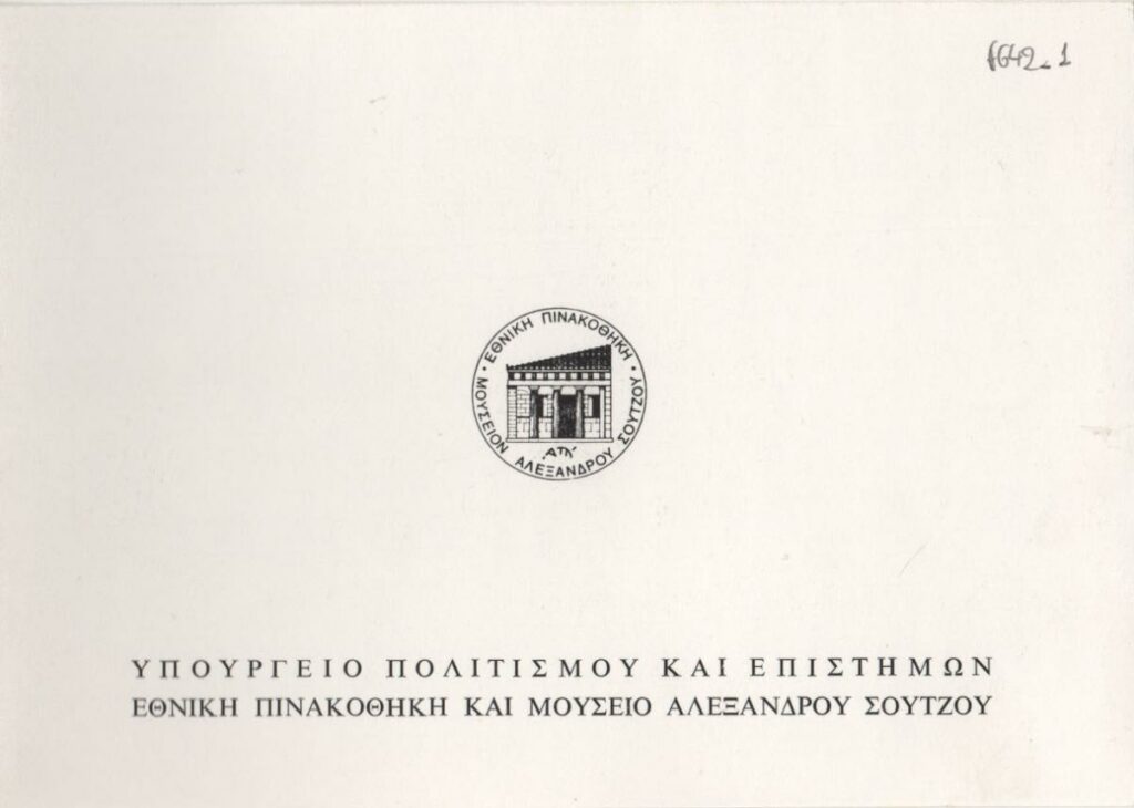Έντυπο, στα ελληνικά, δίπτυχο, χαρτόνι, 11×16 εκ. Πρόσκληση εγκαινίων της αναδρομικής έκθεσης έργων του Γεωργίου Μόσχου στην Αθήνα.