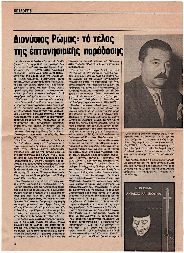 Απόκομμα, έντυπο, χαρτί, 29×21 εκ., όπου δημοσιεύεται, στα ελληνικά, άρθρο για τον κερκυραίο λογοτέχνη Διονύσιο Ρώμα. Εικονογραφείται με αναπαραγωγή φωτογραφιών.