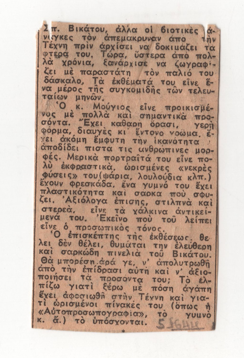 Απόκομμα, έντυπο, χαρτί, 8,3×5,0 εκ., όπου δημοσιεύεται, στα ελληνικά, κριτική ατομικής έκθεσης έργων του Γιώργου Μούγιου.