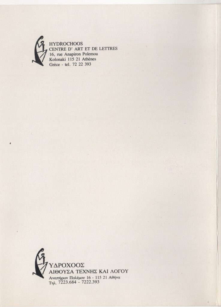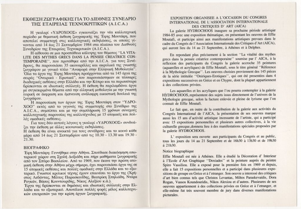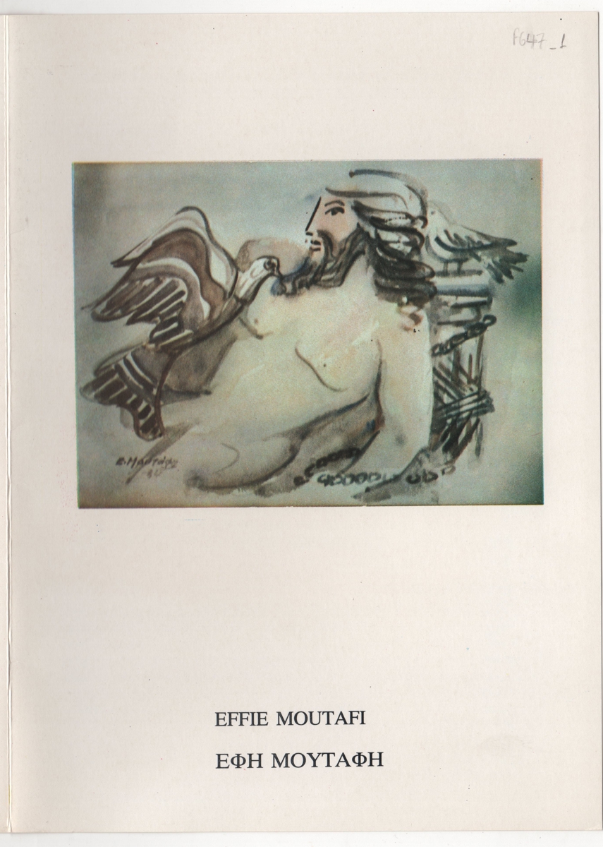 Έντυπο, στα ελληνικά και γαλλικά, δίπτυχο, χαρτόνι ιλουστρασιόν, 23,5×17,0 εκ. Κατάλογος της ατομικής έκθεσης της Έφης Μουτάφη με γενικό τίτλο «Αναφορά στην Ελληνική μυθολογία» στην Αθήνα το 1984. Η έκθεση διοργανώνεται με την ευκαιρία του Διεθνούς Συνεδρίου της Εταιρείας Τεχνοκριτών (AICA). Περιέχει κείμενο για την καλλιτέχνη και σύντομο βιογραφικό. Στο εξώφυλλο εικονογράφηση.