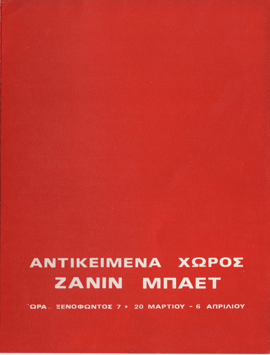 Κατάλογος της ατομικής έκθεσης έργων της Ζανίν Μπάετ με γενικό τίτλο «Αντικείμενα-Χώρος» στην Αθήνα. Περιέχει βιογραφικό της καλλιτέχνιδας και κατάλογο των έργων της έκθεσης. Εσωτερικά, εικονογράφηση.