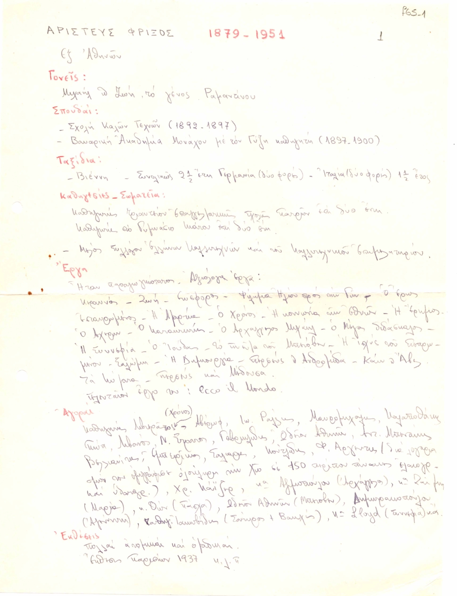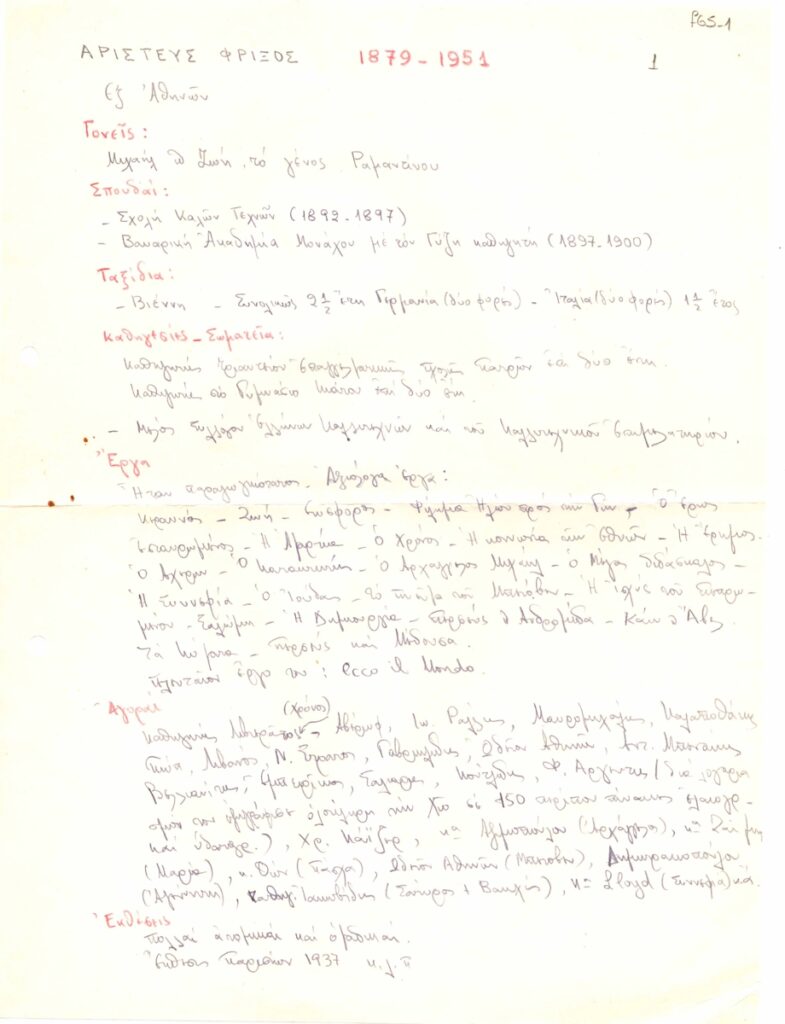 Βιογραφικό, χειρόγραφο, 28,5×21,5 εκ., στα ελληνικά του Φρίξου Αριστευ. Είναι διαχωρισμένο στα εξής : “Γονείς, Σπουδαί, Ταξίδια, Καθηγεσίες-Σωματεία, Έργα, Αγοραί, Εκθέσεις”.