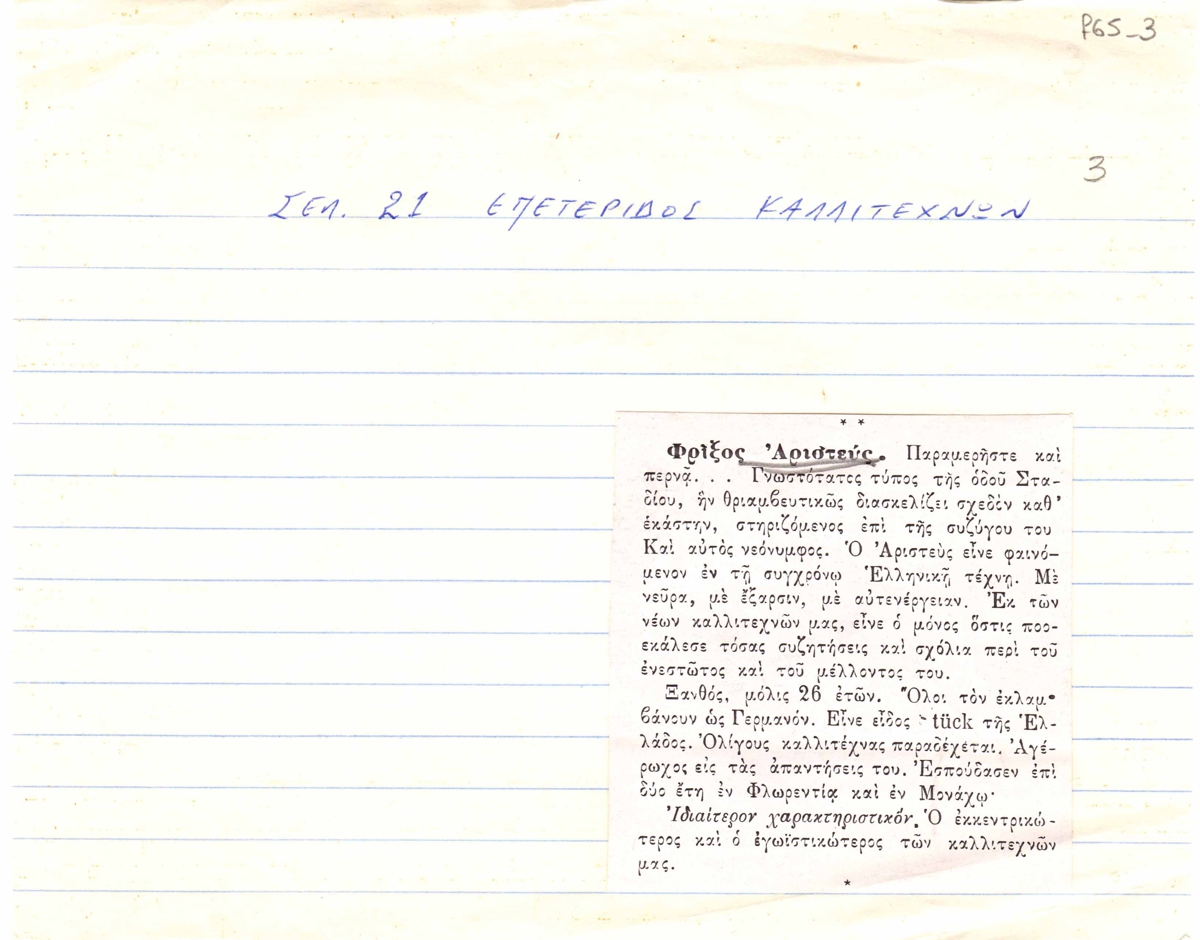 Φωτοαντίγραφο, χαρτί, κολλημένο σε απόκομμα λευκής κόλλας αναφοράς, 8,5×8 και 20,5×16,5 εκ., στα ελληνικά, δημοσίευσης κειμένουγια τον Φρίξο Αριστευ.