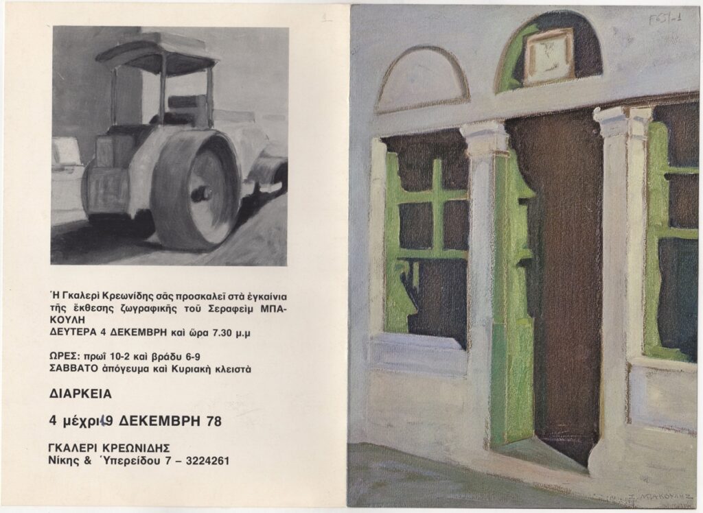 Έντυπο, χαρτί αναδιπλωμένο, 25×17,5 εκ., στα ελληνικά, ατομικής έκθεσης ζωγραφικής του Σεραφείμ Μπάκουλη.