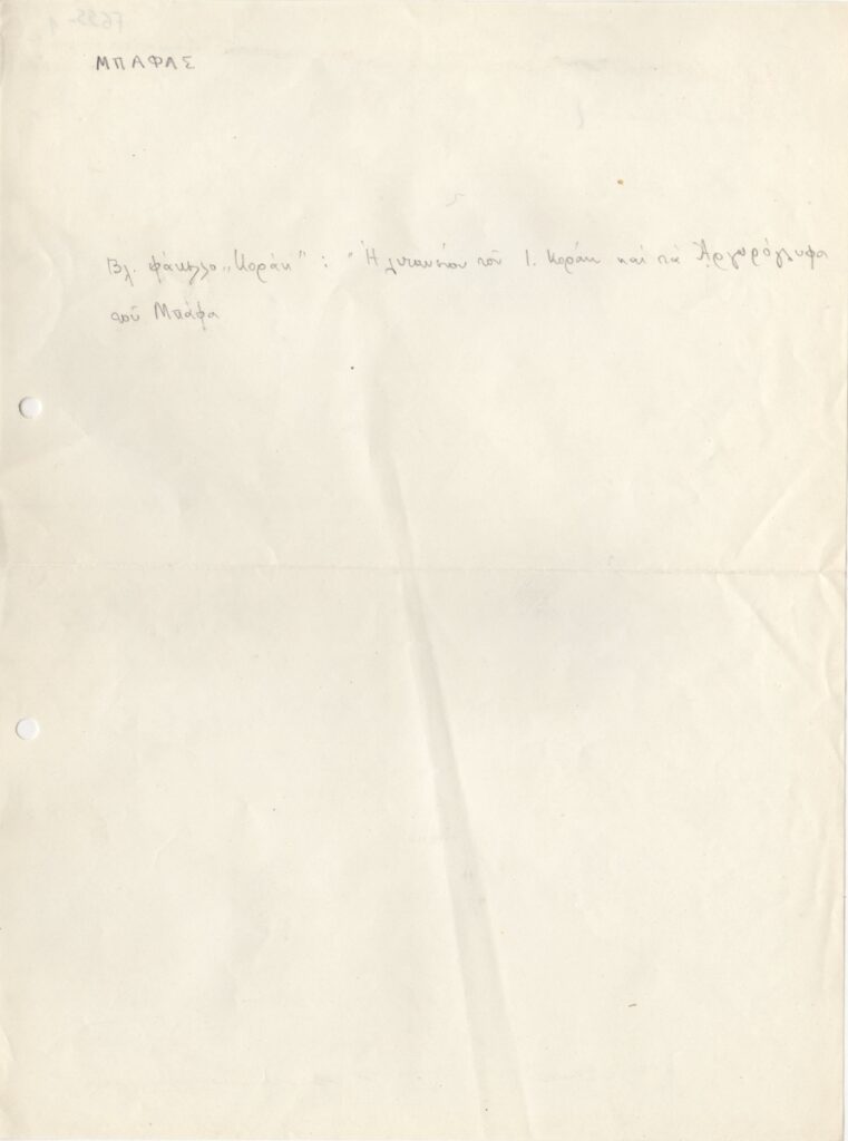 Σημείωση, χειρόγραφη, με μολύβι, χαρτί, 28,5×21 εκ., στα ελληνικά, για τον Διαμαντή Μπάφα.