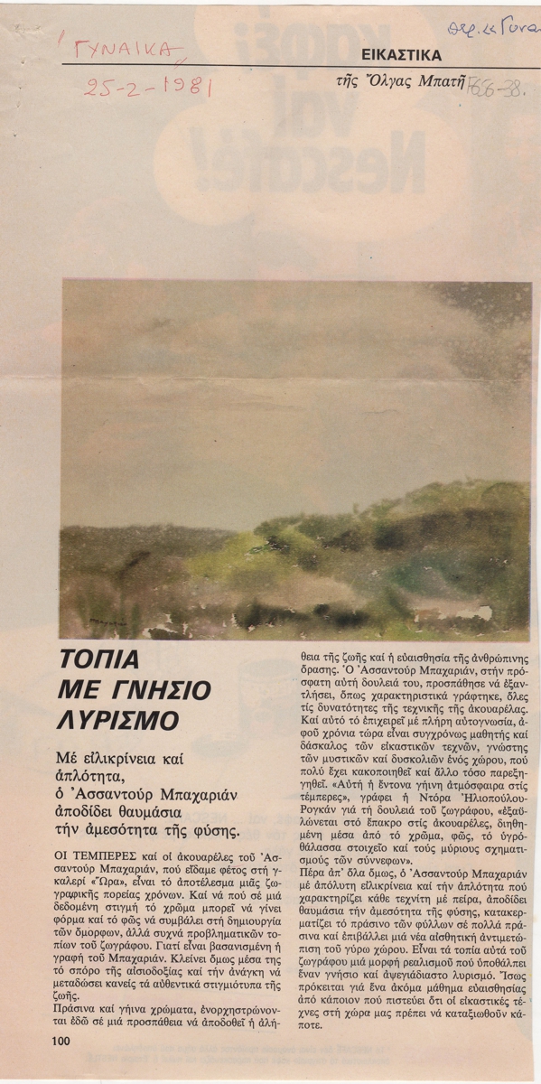 Απόκομμα, χαρτί ιλλουστρασιόν, 15×30 εκ., στα ελληνικά, δημοσίευσης κριτικής έκθεσης του Ασαντούρ Μπαχαριάν, η οποία διεξάγεται στο Καλλιτεχνικό Πνευματικό Κέντρο Ώρα, στην Αθήνα.
