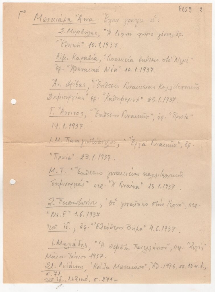 Βιβλιογραφία, χειρόγραφη, με μολύβι, χαρτί, 28×21 εκ., στα ελληνικά, για την Άννα Μπεκιάρη. Γι’ αυτήν έχουν γράψει: Σ. Μυριβήλης, Αιμ. Καραβία, Αν. Δρίβας, Γ. Άννινος, Ι. Μ. Παναγιωτόπουλος, Μ. Τ., Ζ. Παπαντωνίου, Ι. Μηλιάδη, Στ. Λυδάκης, στον Τύπο και σε μονογραφίες.