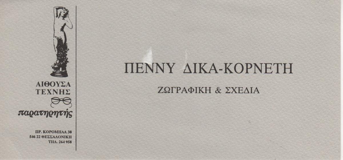 Πρόσκληση εγκαινίων ατομικής έκθεσης της Πέννυς Δίκα-Κορνέτη, απεσταλμένη στην Αλίκη Τέλλογλου.