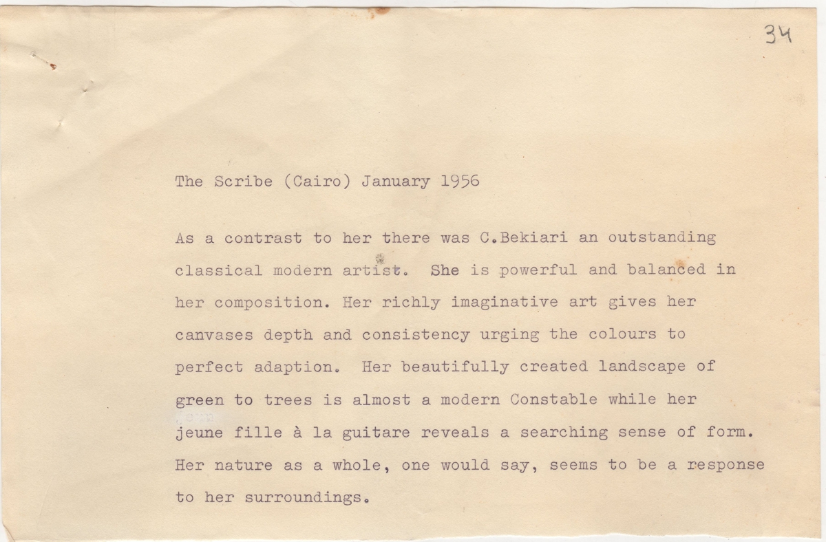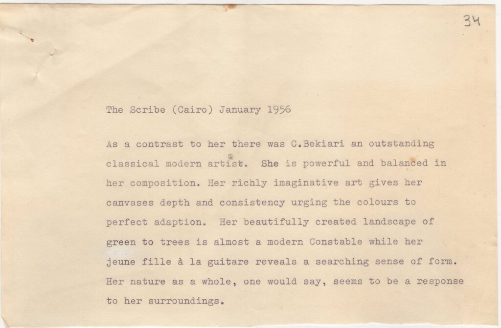 Αποδελτιώσεις, δακτυλόγραφο, χαρτί, 14×21.5, 19.5×21.5, 28.5×21.5 εκ., στα ελληνικά και αγγλικά, πηγών από τον Ελληνικό και Διεθνή Τύπο για την Κούλα Μπεκιάρη. Πρόκειται για κριτικές για το έργο της κατά το διάστημα 1955-1958.