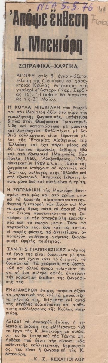 Απόκομμα, χαρτί, 11,5×7 εκ., στα ελληνικά, δημοσίευσης κριτικής έκθεσης της Κούλας Μπεκιάρη, η οποία διεξάγεται στην Γκαλερί Άστορ στην Αθήνα. Αναγράφονται βιογραφικές πληροφορίες.