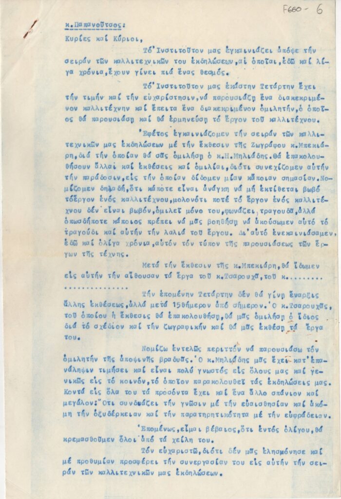 Κείμενο, δακτυλόγραφο, χαρτί, 20 φφ, 29,5×19,5 εκ., στα ελληνικά. Πρόκειται για ομιλία των Ε. Παπανούτσου και Γ. Μηλιάδη, στο πλαίσιο εγκαινίων έκθεσης της Κούλας Μπεκιάρη.