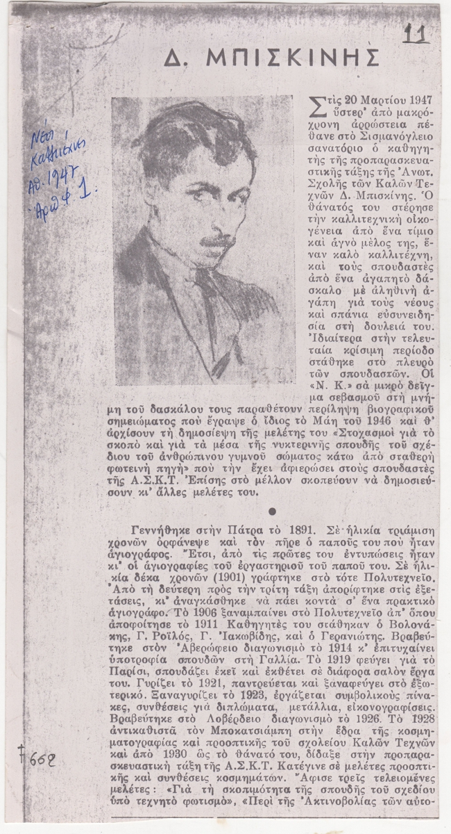 Φωτοαντίγραφο, χαρτί, 2 φφ, 21×11 και 2×11 εκ., στα ελληνικά, δημοσίευσης άρθρου αναφερόμενου στο θάνατο του Δημητρίου Μπισκίνη. Δίνονται βιογραφικές πληροφορίες.