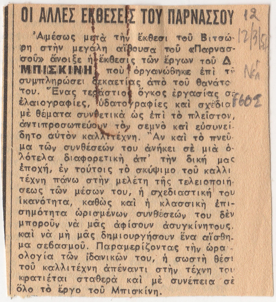 Απόκομμα, χαρτί, 6,5×6 εκ., στα ελληνικά, δημοσίευσης κριτικής της αναδρομικής έκθεσης του Δημήτριου Μπισκίνη, η οποία διεξάγεται στον Φιλολογικό Σύλλογο Παρνασσό, στην Αθήνα.
