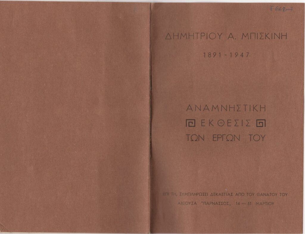 Κατάλογος, χαρτί, 8 φφ, 21×14 εκ., στα ελληνικά, τιμητικής έκθεσης για τον Δημήτριο Μπισκίνη, η οποία διεξάγεται στον Φιλολογικό Σύλλογο Παρνασσό. Στον κατάλογο σημειώνονται τα ονόματα των μελών της οργανωτικής επιτροπής: Γ. Κουρνούτος, Ν. Λούβαρις, Κ. Παρθένης, Κ. Πάγκαλος, Π. Πρεβελάκης. Ακόμη, περιέχει βιογραφικό σημείωμα του καλλιτέχνη, τιμοκατάλογο έργων και εικονογράφηση.