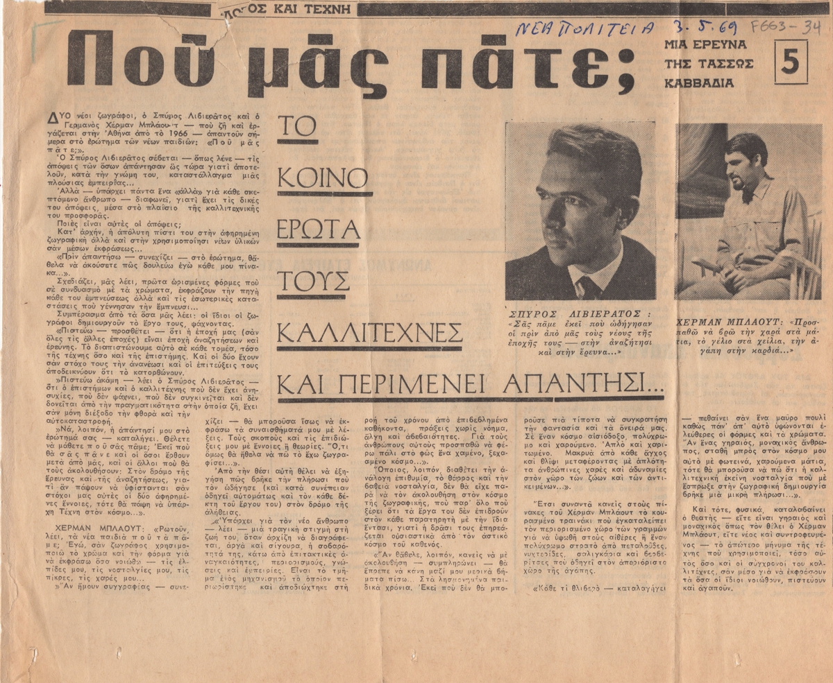 Απόκομμα, χαρτί, 22×27 εκ., στα ελληνικά, δημοσίευσης συνέντευξης των Χέρμαν Μπλάουτ και Σπύρου Λιβιεράτου, στην οποία μιλούν για το εικαστικό τους έργο και την Τέχνη. Πρόκειται για έρευνα που διεξάγει το έντυπο.