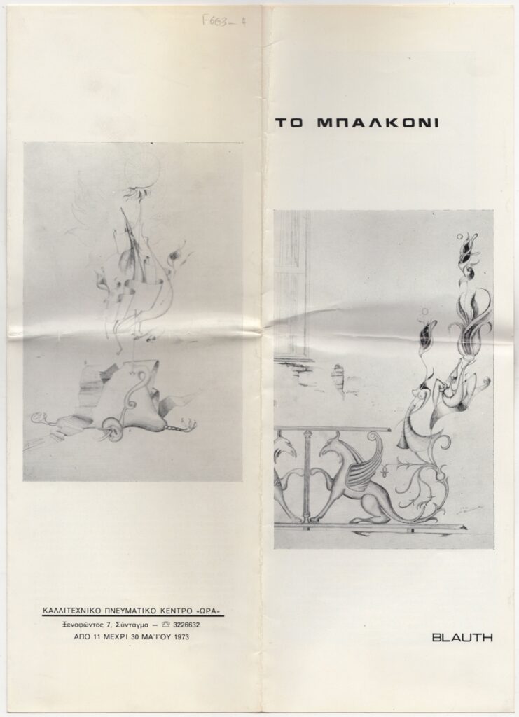 Έντυπο, χαρτί ιλλουστρασιόν δίπτυχο, 35×12,5 εκ., στα ελληνικά, ατομικής έκθεσης ζωγραφικής του Χέρμαν Μπλάουτ. Περιέχει σύντομο βιογραφικό σημείωμα, κείμενα των Κ. Μεραναίου, Ελ. Κυπραίου, Στέλιου Λυδάκη για το έργο του και εικονογράφηση.