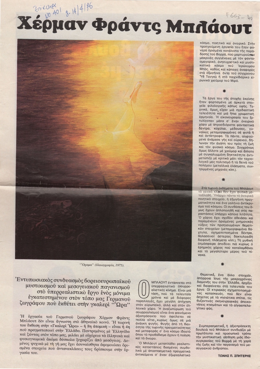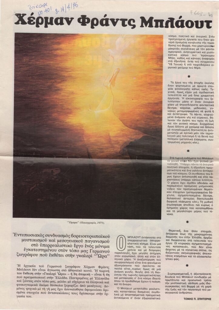 Απόκομμα, χαρτί, 2 φφ, 33×23.5 και 33×11.5 εκ., στα ελληνικά, δημοσίευσης κριτικής έκθεσης του Χέρμαν Μπλάουτ, η οποία διεξάγεται στο Καλλιτεχνικό Πνευματικό Κέντρο Ώρα στην Αθήνα.