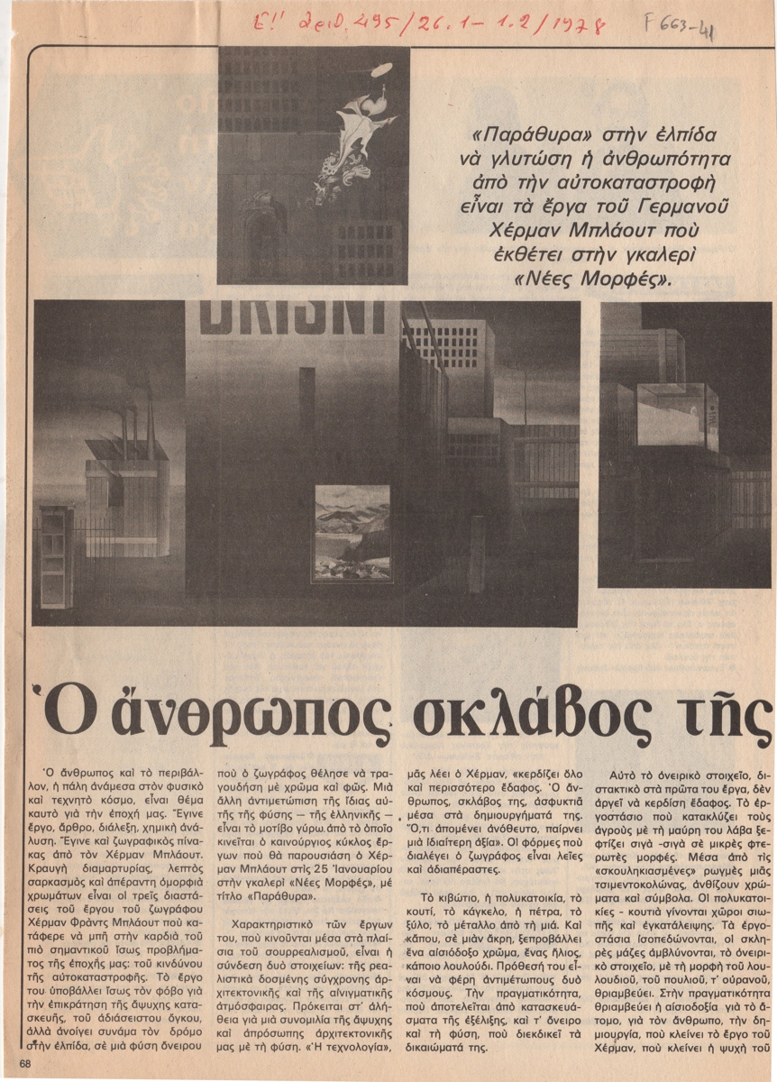 Απόκομμα, χαρτί, 2 φφ, 30×21 εκ., στα ελληνικά, δημοσίευσης κριτικής έκθεσης του Χέρμαν Μπλάουτ, η οποία διεξάγεται στην Γκαλερί Νέες Μορφές στην Αθήνα.